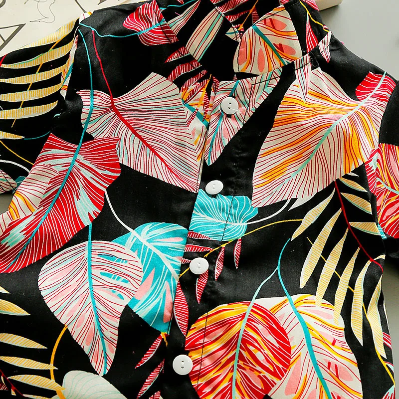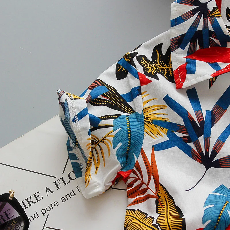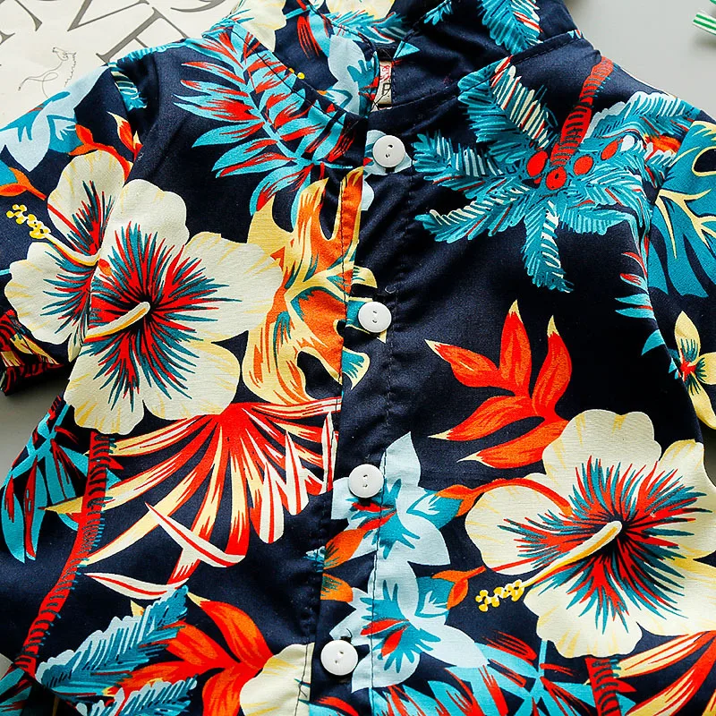 The Meng Tian Kai 1-6 Year Baby Boys Floral Printed Clothes Set is perfect for summer holidays and beach outings. Made with 95% cotton, the set includes a short-sleeved shirt and shorts in a fashionable, turn-down collar design. Available in sizes for infants and children between 1-6 years old.
