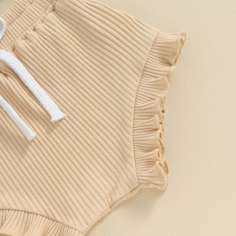 This stylish and comfortable baby girl outfit set is perfect for warm weather. The set includes a ruffled sleeveless top, elastic shorts, and a matching headband made from high-quality cotton and polyester fabric. Featuring a pullover closure and O-neck collar, it's easy to dress your little one. Available in sizes 0-24 months. Perfect for any occasion.