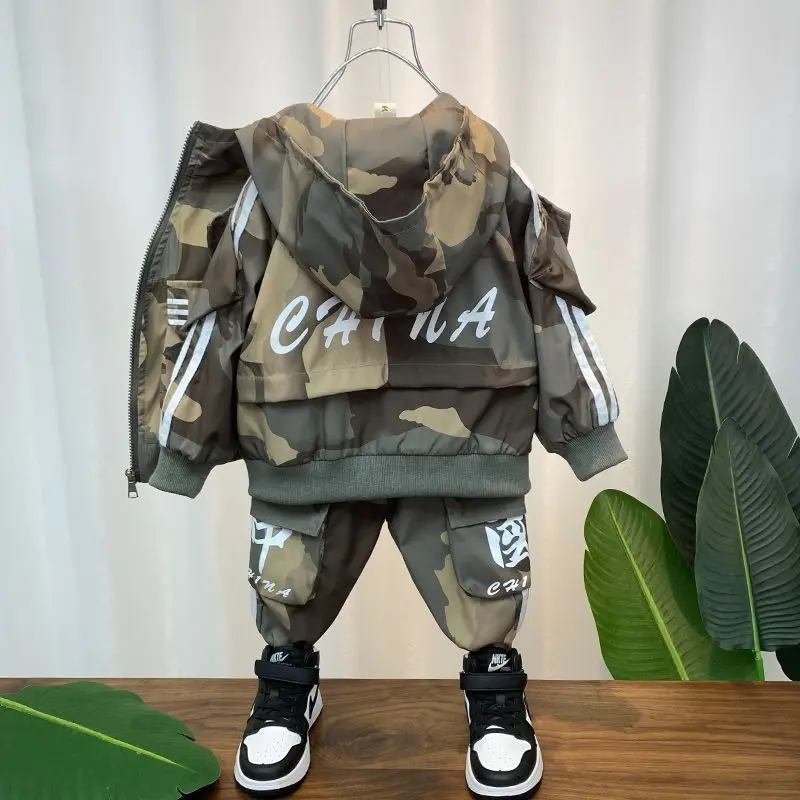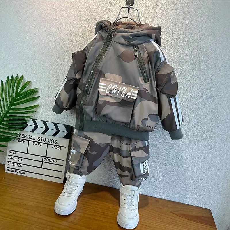 Boys' Baby Clothes Set Autumn and Winter New Children's Hooded Thickened Camo Sweater Pants 2 Piece Set