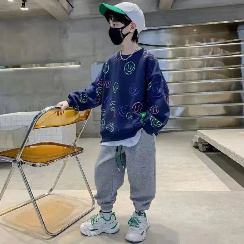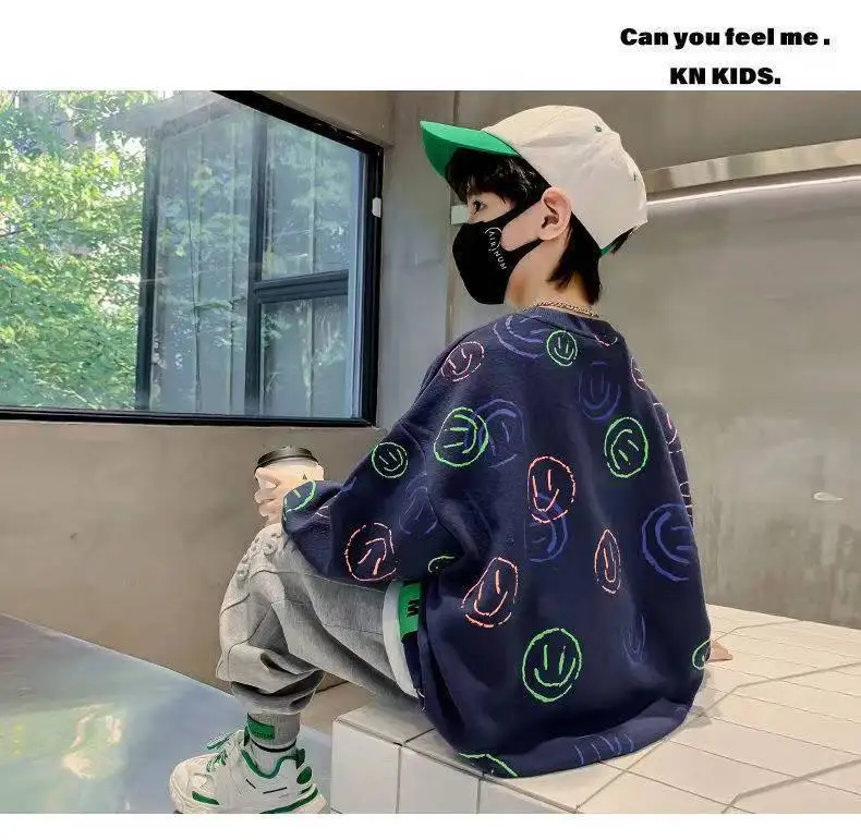 Children's Sweatshirt Autumn Boys Smile Print Long-Sleeved Korean T-Shirt Kids Clothes Fashion Streetwear Black Cotton Costumes