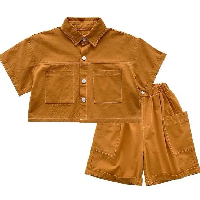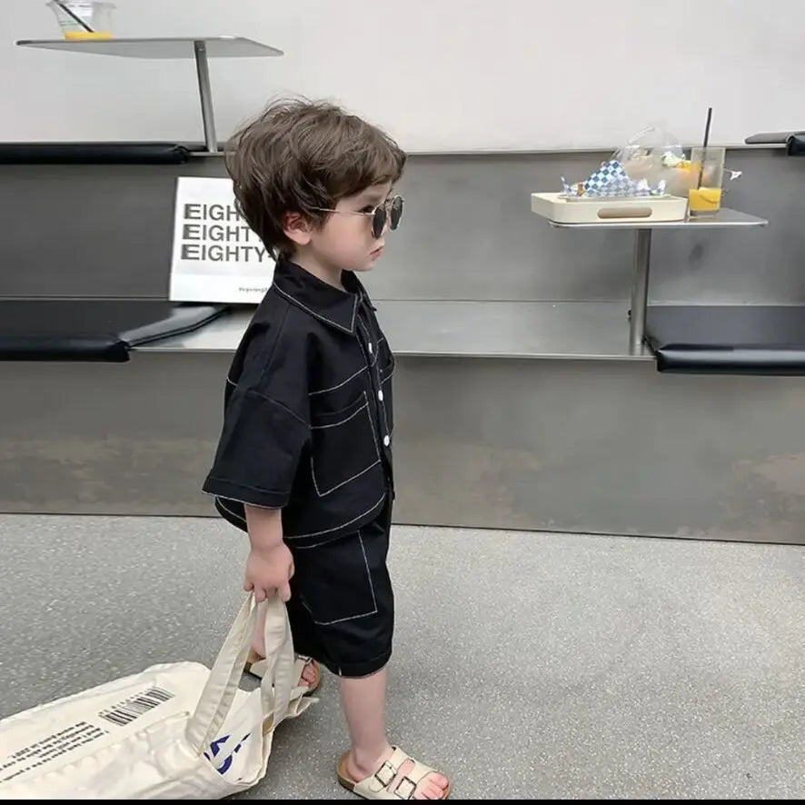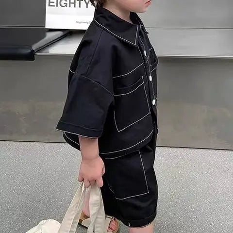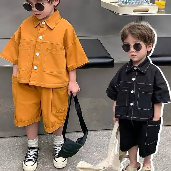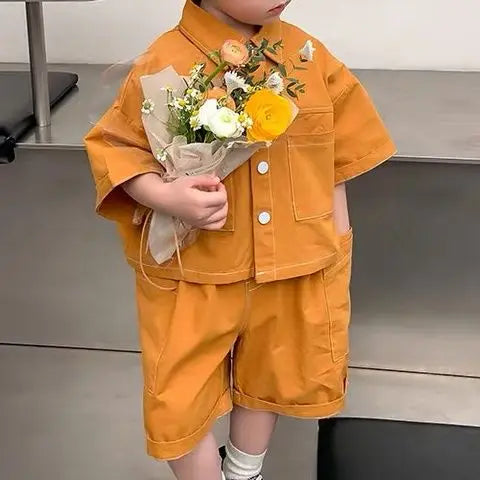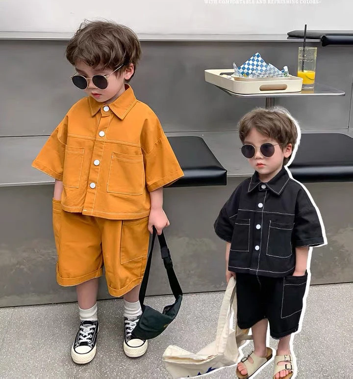 Fashion Clothes Boys Short Sleeved Top 2022 Summer New Children Clothes Solid Color Clothes Shirt Cute Capri Pants Two-piece Set
