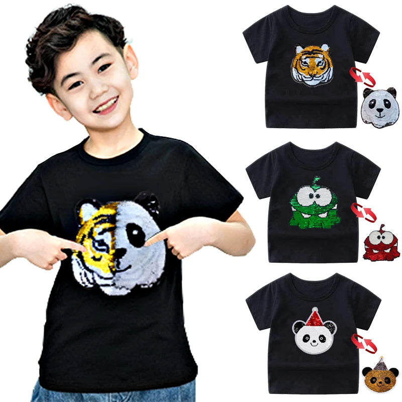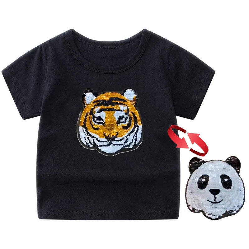 Panda Tiger Dinosaur Sequin Children T Shirt for Boys Tshirts Kids T Shirt Cartoon Print Summer Tops T-shirts for Baby Clothes